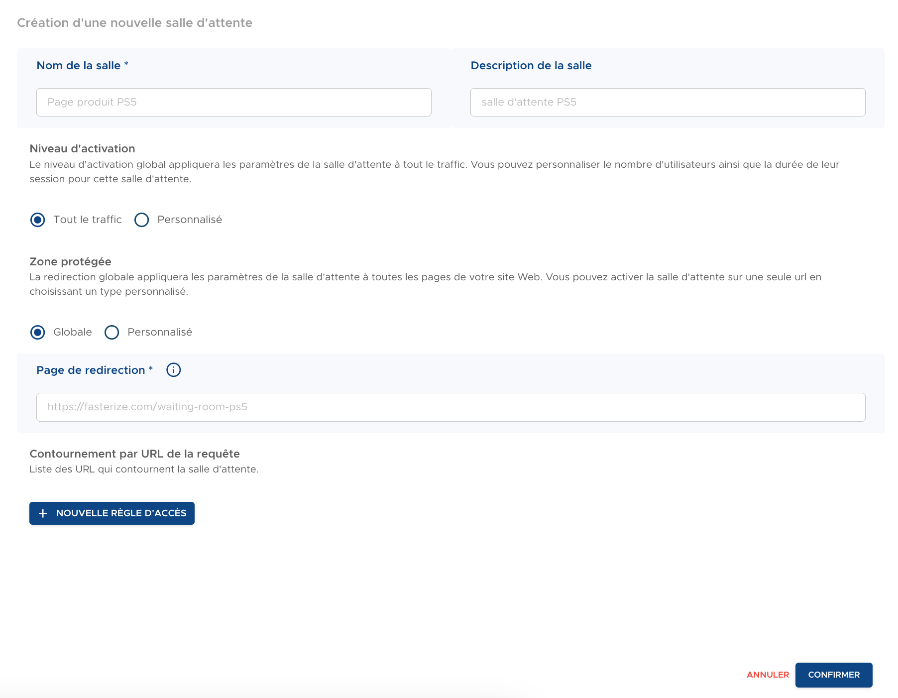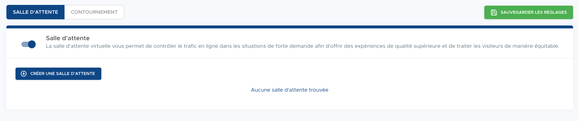 Activez l’application Traffic Limiter depuis votre interface Fasterize, puis cliquez sur “Créer une salle d’attente”.