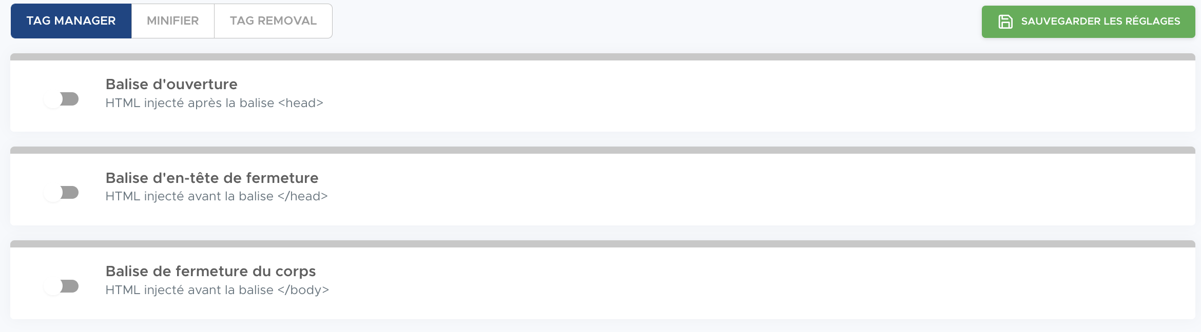 Le Tag Manager vous permet d’ajouter dynamiquement du code HTML, CSS ou JavaScript dans votre page. Vous pouvez choisir parmi 3 emplacements :